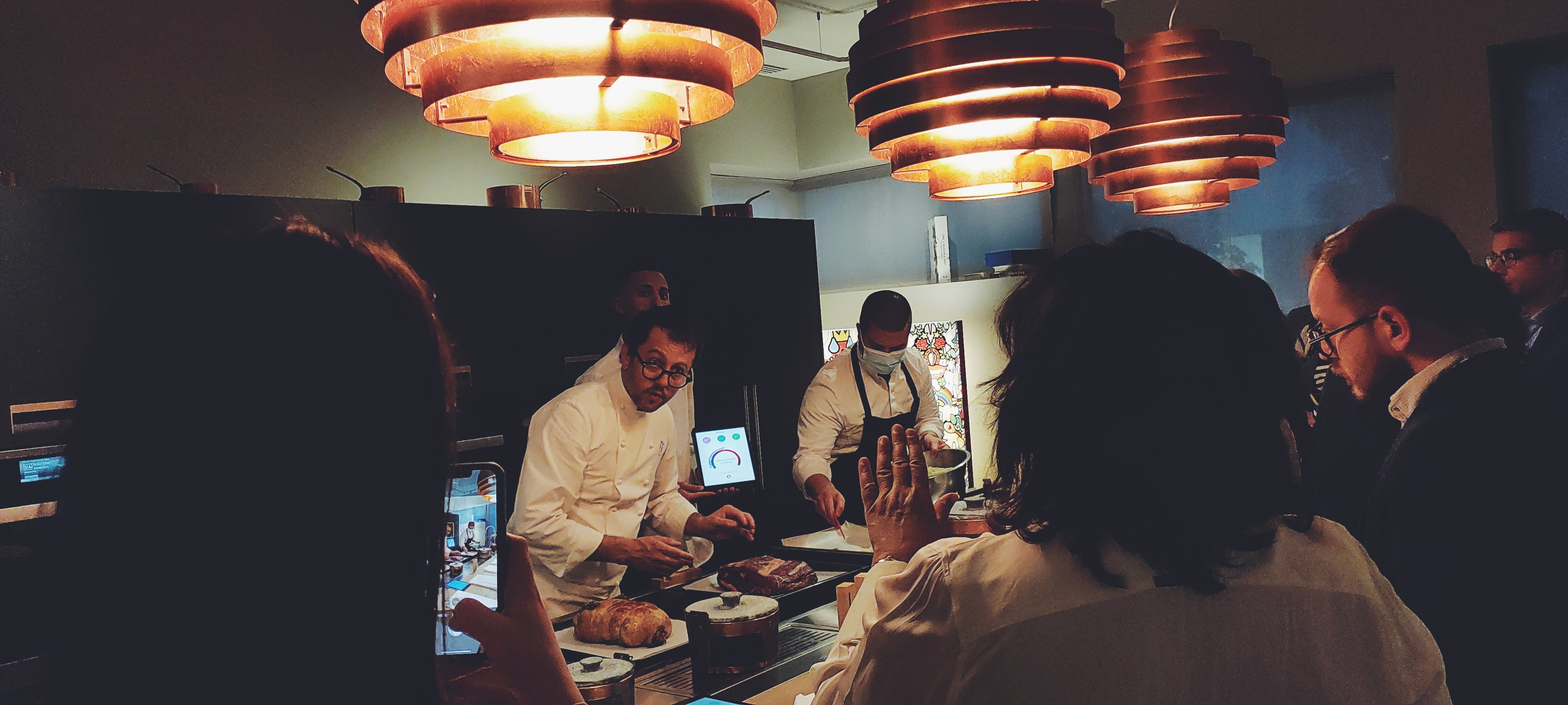 In via del tutto esclusiva abbiamo organizzato per un numero selezionato di giornalisti del settore food un evento privato presso "Il teatro dei sapori" del ristorante due stelle Michelin "Il Luogo di Aimo e Nadia", a Milano. Lo chef Alessandro Negrini ha coinvolto i 10 ospiti in una cooking class: un momento interattivo che ha permesso alla stampa presente di vedere MEATER all'opera nel monitoraggio della temperatura delle pietanze. Ne è poi seguita una cena con un percorso gourmet creato ad hoc dallo chef e dalla sua brigata che esaltasse le possibilità e occasioni di utilizzo del dispositivo.