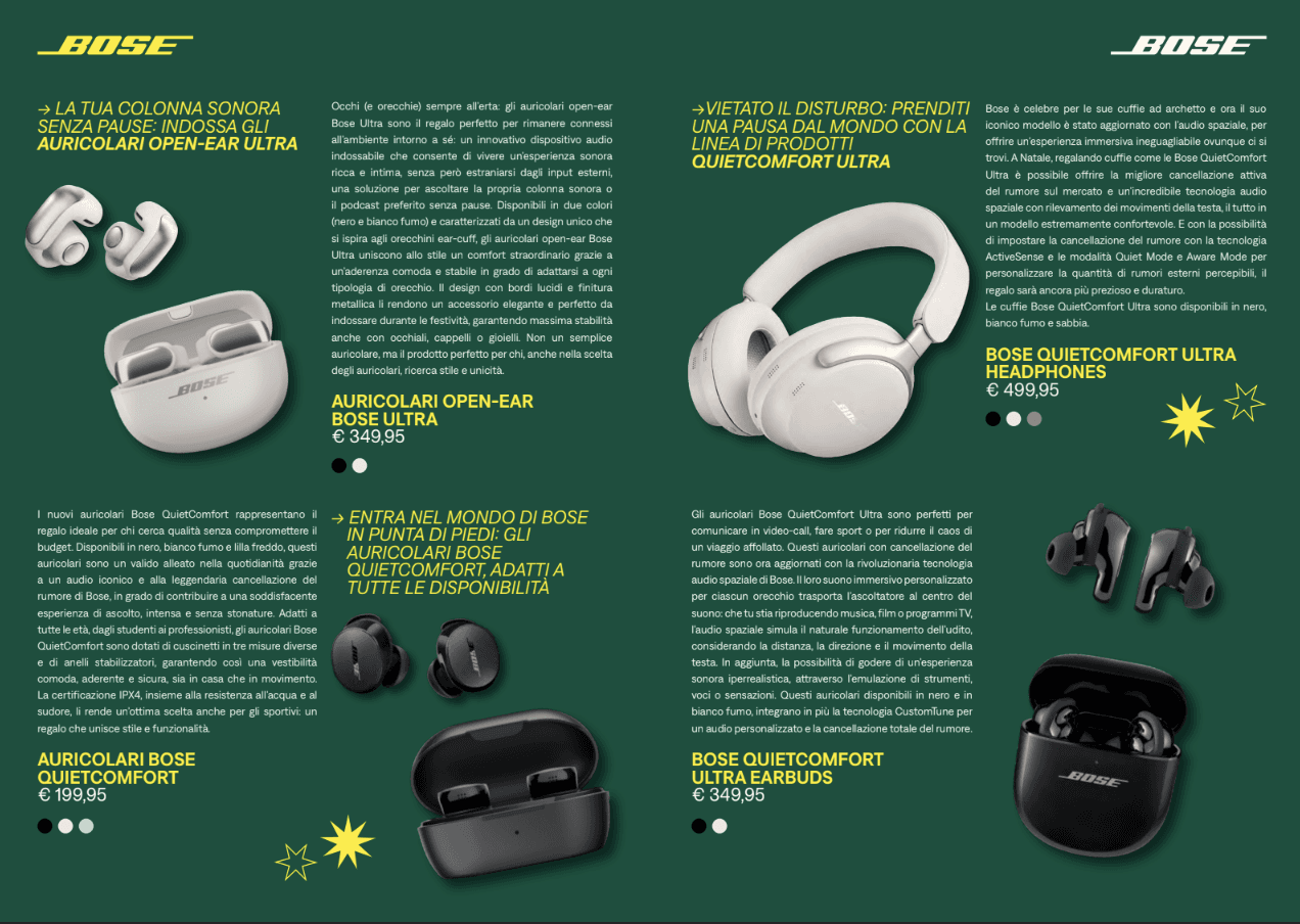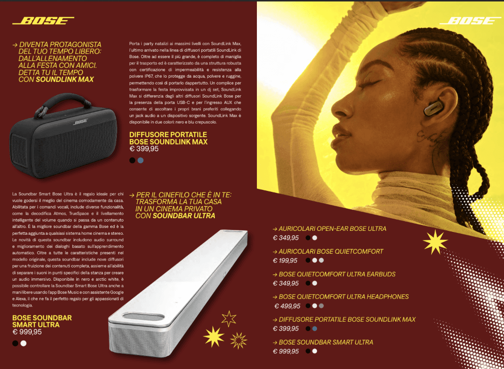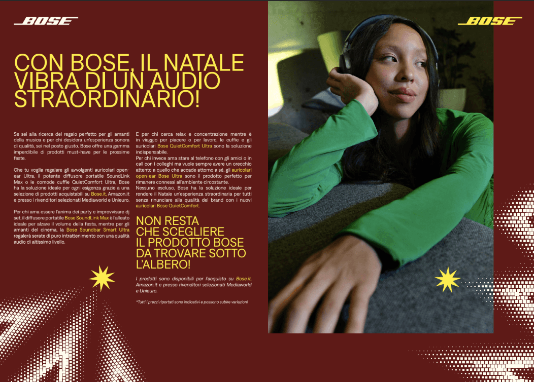 Per presentare il catalogo prodotti di Bose in vista del periodo, e degli acquisti natalizi, abbiamo collaborato con un'illustratrice esterna alla realizzazione di un lookbook esclusivo dallo stile accattivante. I testi coinvolgenti e le grafiche in pieno mood festivo hanno reso il depliant uno strumento dal forte impatto visivo, perfetto per presentare i dispositivi Bose come l'acquisto o il regalo più desiderato sotto l'albero di Natale. La versione definitiva del lookbook è stata stampata e consegnata personalmente, attraverso incontri one-to-one, ai giornalisti più influenti per le vetrine natalizie. Per chi non ha potuto riceverlo in formato fisico, è stata inviata la versione digitale.